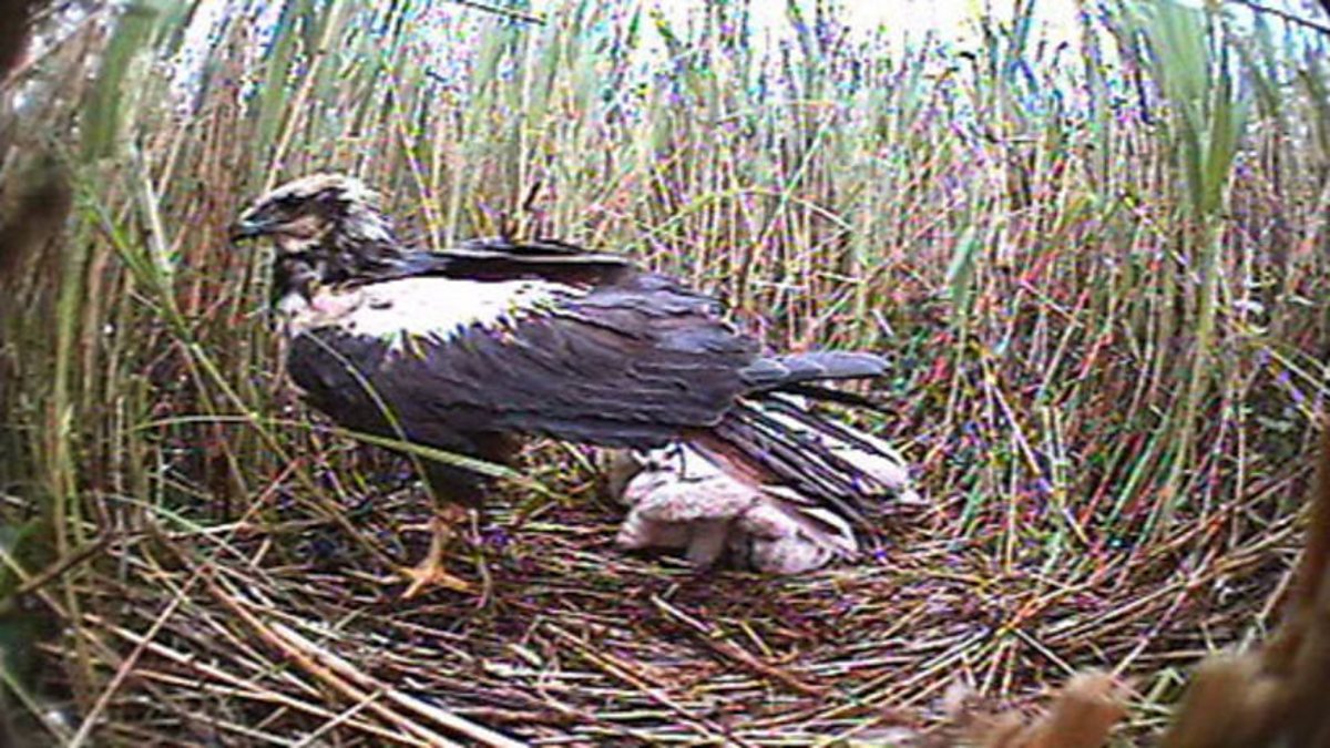Chris Packham visits Sculthorpe Moor with Nigel Middleton of the Hawk and Owl Trust to see marsh harriers. There is one male and two females here - the male may be looking after two nests. There are now over 300 breeding pairs of marsh harriers in the UK but that still makes it as rare as a golden eagle. East Anglia is its stronghold but there's no room for complacency, as these birds have had a chequered history. Chris and Nigel watch the female flying about in the rain, shaking her wings to try and dry them off. Chris thinks she needs some sunshine!
