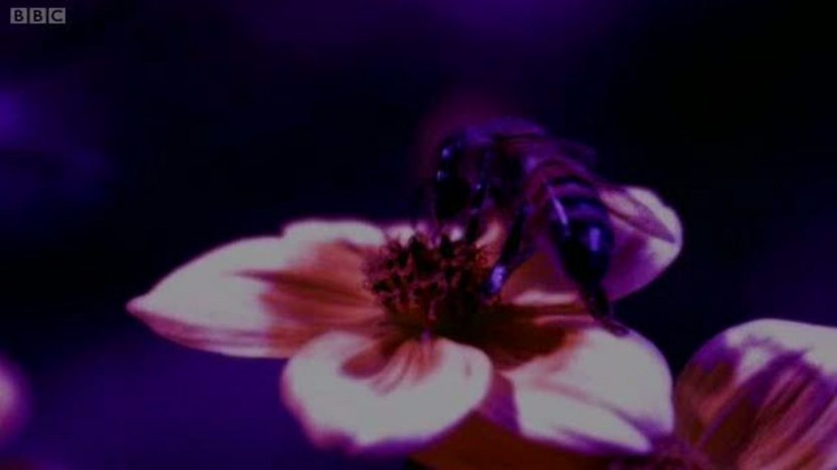 Alongside the garden that we see, there's an invisible garden. A garden of hidden signs and secret codes all designed to attract the attention of passing insects. That’s because insects can't see our world very well at all, but they can see ultra-violet. Take the honey bee. Many plants need the honey bee for pollination: no bees, no pollination and with no pollination there's no reproduction. So bees are actually a matter of survival for many plants. Because of this, flowers have had to learn to advertise themselves to bees in a way that bees can understand. A bee's view of the garden is very different, there are hidden patterns within all the flowers when looked at in ultra-violet light, like secret ink. The markings are caused by special compounds in the flowers called flavinoids. To the bees, they are like aircraft landing lights, guiding them in to the nectar and pollen at the heart of the flower.