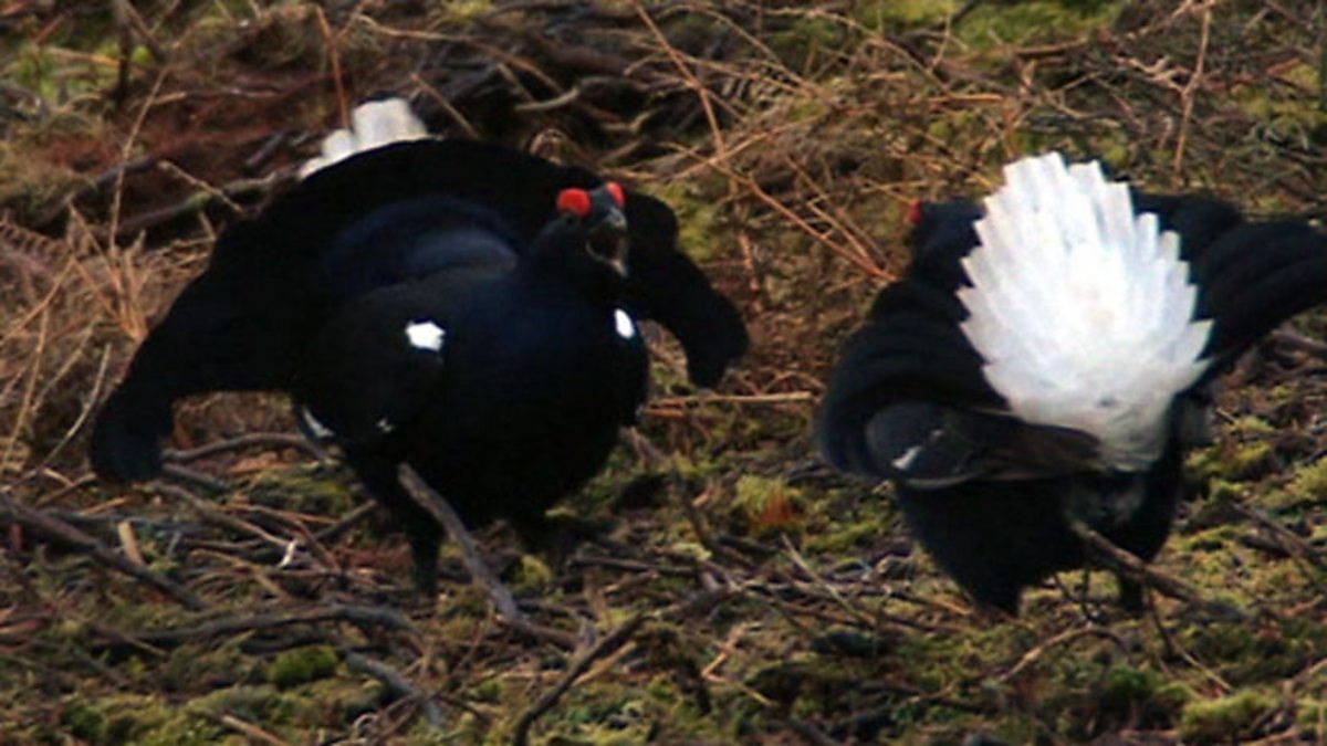 Simon King is up early to watch black grouse males call and display on their traditional display grounds at dawn. In spring and summer the males fight over their mini-territories - and as they return here every morning, they may fight the same neighbour every day. they peck and kick, targeting the red wattles. This is an increasingly rare sight in Britain now. Black grouse are not doing very well – perhaps as a result of wet springs and summers. These are not good for ground-nesting birds as their soaked chicks get chilled and die.