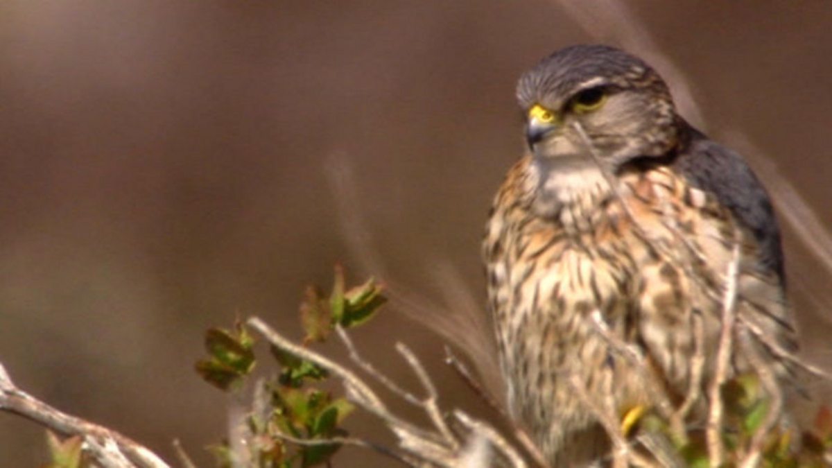 Merlins are the UK's smallest bird of prey. The female is a bit bigger than the male, being about the size of a mistle thrush. They punch well above their weight as here where a merlin takes on a red kite, despite being dwarfed by it. The merlins are nesting beside the hen harriers - they both benefit from this. The merlin chases away predators that might bother the harrier and in turn can catch the prey that the bigger bird flushes out but doesn't catch. Simon shows some old film from a series he filmed some years ago, Trials of Life. It shows a merlin chasing a still vibrantly singing skylark.