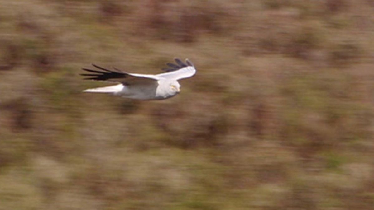 Simon King and the Springwatch team have been following a pair of hen harriers nesting on a heather moorland. The male is providing well, by doing most of the hunting for his mate and bringing back plenty of prey which he passes to the female mid-air. He's a bit nervous of her - she's much bigger than he is. She feeds on the ground, so may not have eggs in the nest yet or may already have well-grown young. She keeps bringing nest material back to the area where Simon King thinks her nest is hidden.