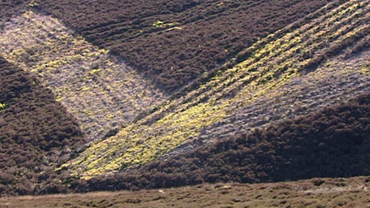 Simon King is on the heather moorland above Lake Vyrnwy in Wales. Heather moorland is a managed landscape. Normally the heather is burned off on moorland like this, to prevent it getting too tall and woody, but it's too wet to burn reliably in Wales. Instead, large strips are being cut back by the RSPB, strips of varying widths encourage a flush of new life and attract diverse species. New plants, such as bilberry, attract insects which are in turn followed by small birds such as meadow pipits and stonechats and ultimately the predators that feed on them.
