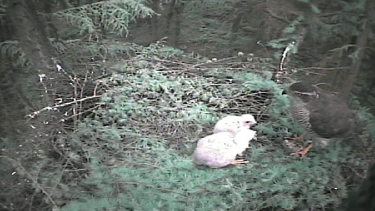 The goshawk chicks being filmed 12 metres up a tree are growing and becoming more confident. They depend on the female to tear up their prey for them. What does the difference in size between the chicks mean for their feeding? Simon King and the Springwatch team have watched and analysed who gets what for one meal. The big chick gets the lion's share of the meal. The little chick is weaker so will lose out when the two battle to get what's offered. By the time the big chick is fully sated he's had 153 mouthfuls. The little chick can now get to everything that's left, but there isn't much. Final result - little chick 98 mouthfuls, big chick 153. So the little chick is getting enough, but it's significantly less than its sibling.
