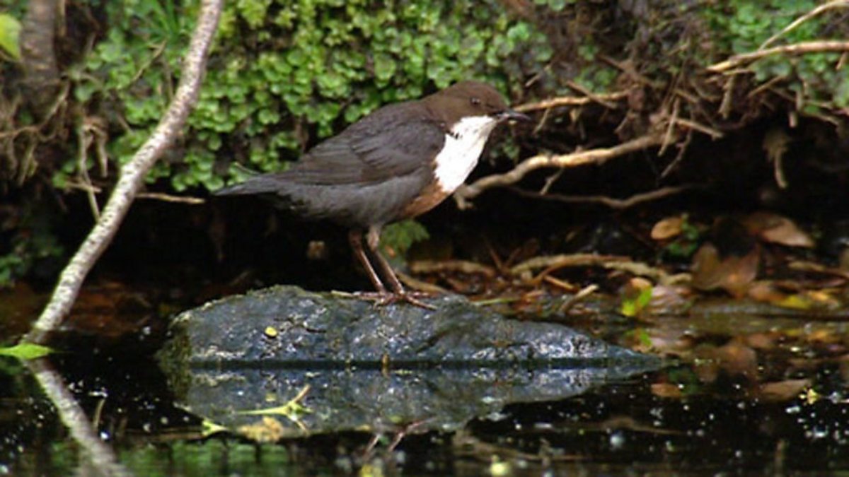 Simon King watches dippers in Wales. They are quite shy so not often seen. They feed on aquatic insects such as caddis fly larvae on the river bed – one of the few birds that can dive in this way. But these dippers have also been catching fish which is quite unusual. Simon looks at the types of insect life found in the river - all signs of clean water. Slow motion footage shows how these buoyant birds face into the water flow and dive underwater. The fact that the dippers are not immediately eating their prey, but flying off with it shows that they are nesting. How do dippers cram so many insects in their beaks without dropping them? They wedge them in the back of their mouth and probably hold them in with their tongue. Why do they dip? No one is quite sure, but perhaps it is to help navigate and spot fixed points in their field of view, or to help see into the water, or to advertise to other dippers. The clip ends with a montage put together by the Springwatch editors who think the dipper just has a very good sense of rhythm.