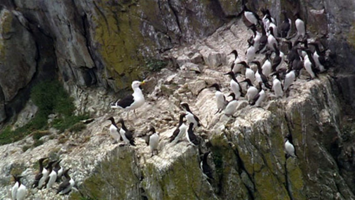Guillemots are superbly designed for life at sea – they literally fly underwater. On land they're a little more ungainly. In April they come back to shore to nest on sea cliffs. They lay their eggs on bare rock. It is a very safe place to nest because land predators such as foxes and weasels can't get at them. But how on earth do they keep their eggs from falling off the cliff? Guillemots have evolved a conical egg, which swivels around its point when disturbed - unlike a hen's egg which would just roll straight off the rock. Simon demonstrates with a model egg. The nests are, however, vulnerable to attack from the air. Gulls patrol the cliffs looking for a weak link in the guillemot defences. They meet a line of pointed beaks to keep them away. Black-backed gulls muscle into the colony and use their size to manage to grab an egg. Herring gulls regularly mob the larger black-backs to dive them away, as they have their own nests to protect.