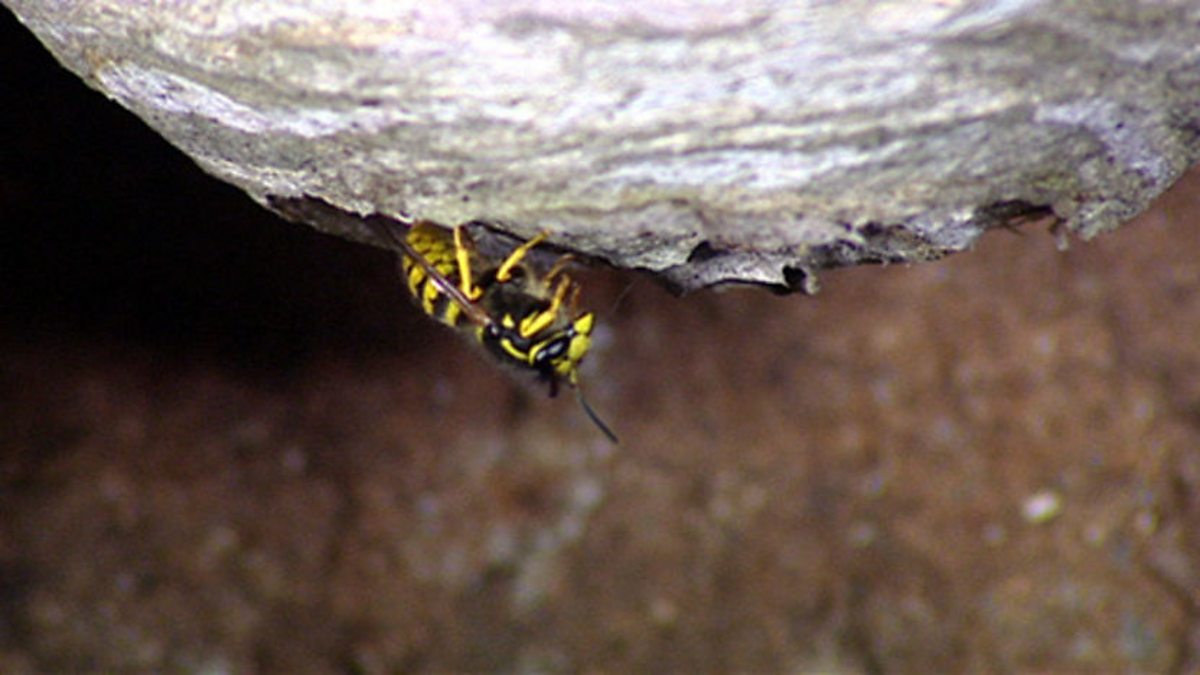 Some wasps have taken up residence in a nestbox intended for kingfishers. Kate Humble and Chris Packham go to see them. They have to keep quiet so as not to disturb the wasps. The nestbox is dry, secure and there is plenty rooom here for the wasps to expand the nest size. They are laying down new layers of paper. They chew up dead wood to make it. There is a pile of wasp guano below the nest, where the wasps squirt it. Chris thinks wasps are beautiful and much misunderstood. Kate says they are very hypnotic to watch.