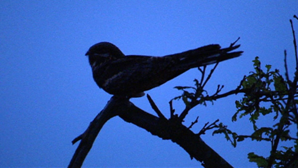 Chris Packham and David Tipling watch a male nightjar on its roost. The female is on the nest somewhere nearby. The male will return to the same roost regularly - he has several roosts in the area. He is fantastically well camouflaged. As twilight comes they head out onto the heath to watch the male's activity. Nightjars are usually elusive, but David has been photographing this one for three years and gradually been able to get closer and closer. Jazz music can be heard from the nearby campsite, but Chris hopes the nightjar will drown it out. The male arrives and calls to the female. His beak looks small but can open really wide to catch insects. Nightjars are crepuscular - they come out at dusk and dawn. They can fly several kilometres in search of food.