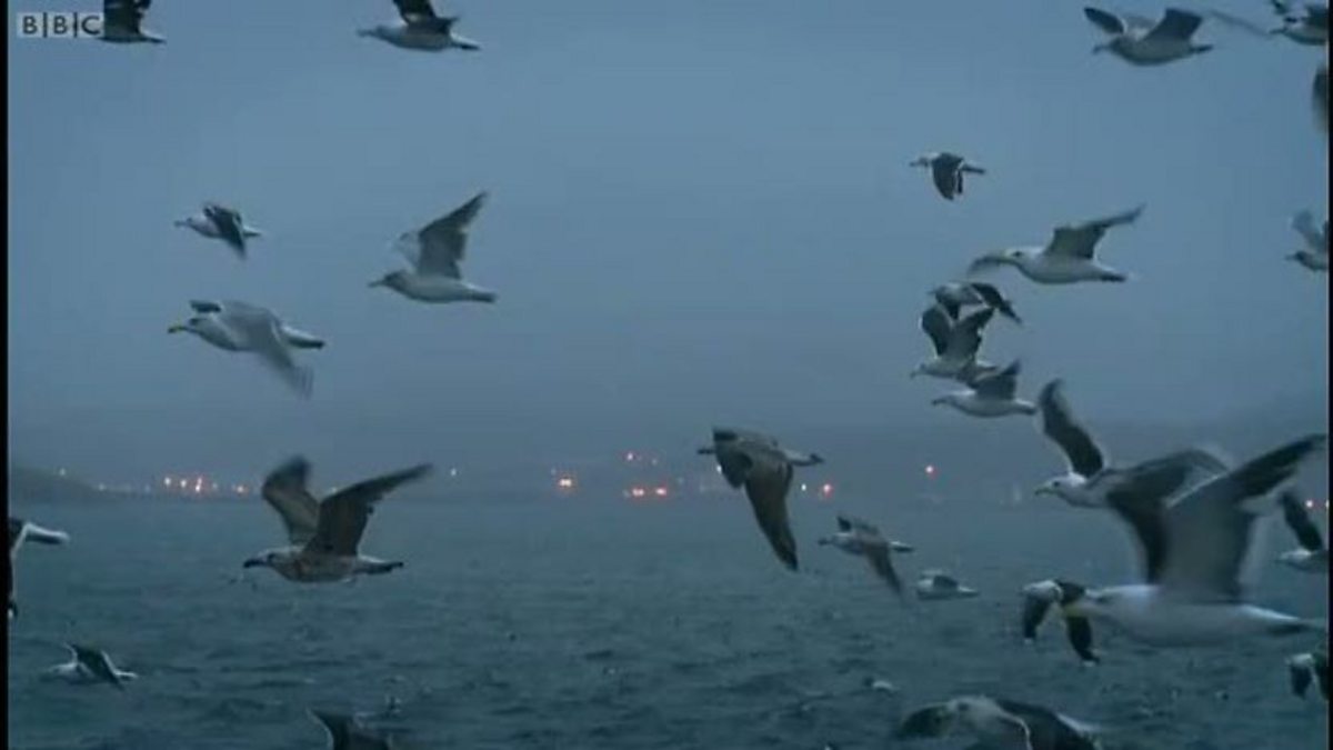 On the start of the second trip out of port in search of killer whales, Gordon Buchanan and the film crew are treated to another wildilfe spectacle. They are accompanied on their journey by a huge flock of gulls. There are rich pickings out at sea, and not just for humans in fishing boats. The gulls know this too so make a beeline in their hundreds to trail any likely looking boats.