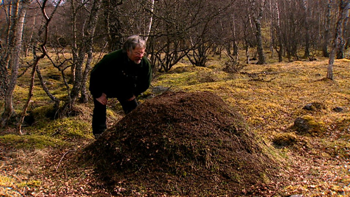 There are some creatures that are incredibly numerous but very easy to overlook. Bill Oddie is in a birch wood in Speyside. He finds what look like piles of earth dug up by workmen, but they are in fact enormous wood ant nests. The nests are thatched so the are lovely and warm inside and they're waterproof. On the shady side, there is the odd ant or two wandering about. However on the side where the sun hits, it is seething with ants. Bill picks up a few for a closer look. Will they bite? The general rule with ants is that if they're black they won't, if they're red, they will. These ones are red and black - and they do bite Bill. They can do serious damage to their prey. Their jaws can chop a caterpillar up into pieces to carry back to their nest. A wildlife watching tip - don't just carry binoculars, take a magnifying glass to see some amazing views, and never assume there is nothing to see.
