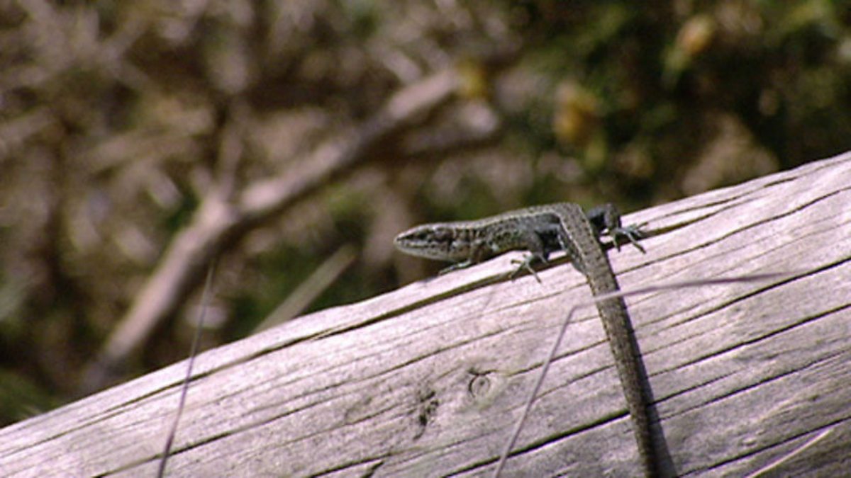 Bill Oddie has been to Dorset a lot, but despite it being home of Britain's 'Big Six' reptiles, he has never seen one. So he's off to try and find some sand lizards in the dunes. He finds footprints in the sand. Lizards come out when it warms up, as they need energy from the sun. Bill spots a lizard and thinks it might be a male sand lizard, because it has a greenish colour. But he checks his guide books and realises it was a common lizard. He tries again and this time he does find a sand lizard, which is a much more vivid green than the common. Despite the bright green colour it is well camouflaged.