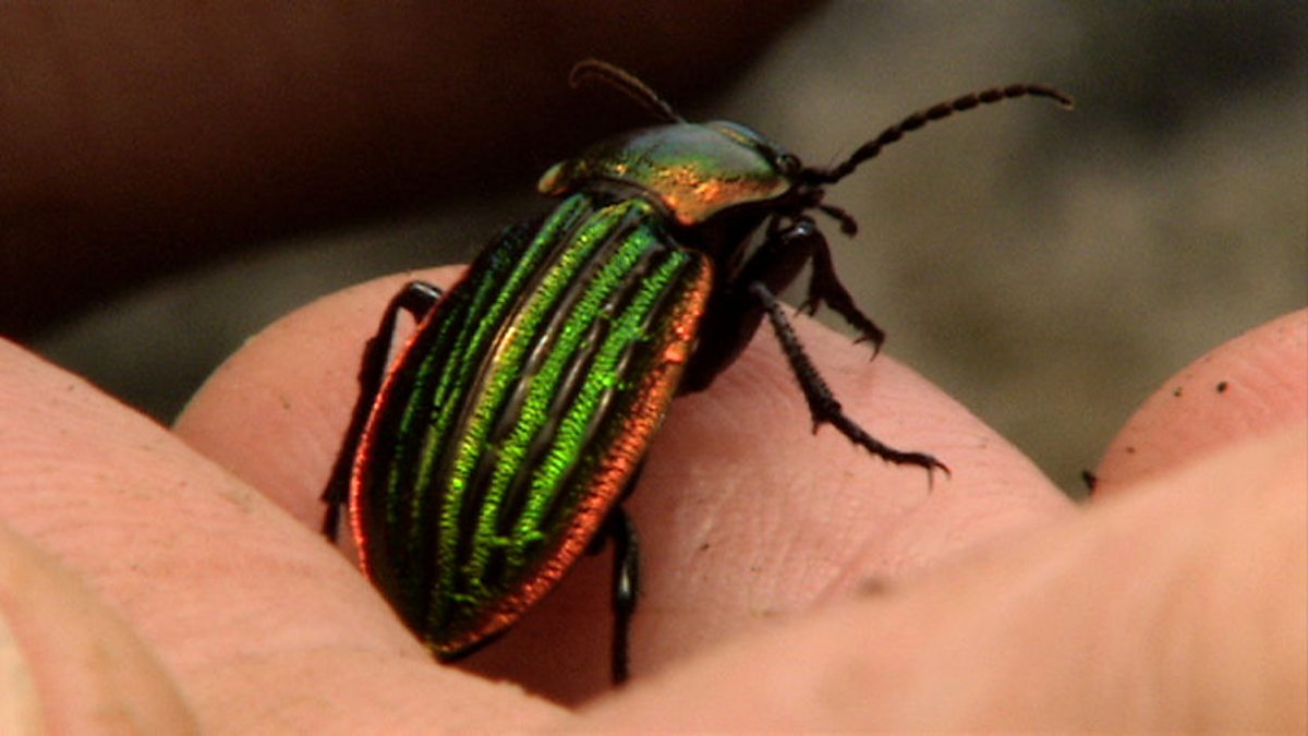 Not far from the moors of Dartmoor are some verdant woodlands where Bill Oddie and John Waters go looking for beetles. Grubbing around in the undergrowth is the best way to find them. They find several iridescent ground beetles, most of which don't have common names. Carabus arvenis is a bronze colour, Carabus nitens is a metallic green. The third species is a daytime hunter. Ground beetles are fast runners that chase down their prey of other beetles and flies. They lock on to them with their jaws and munch on them.