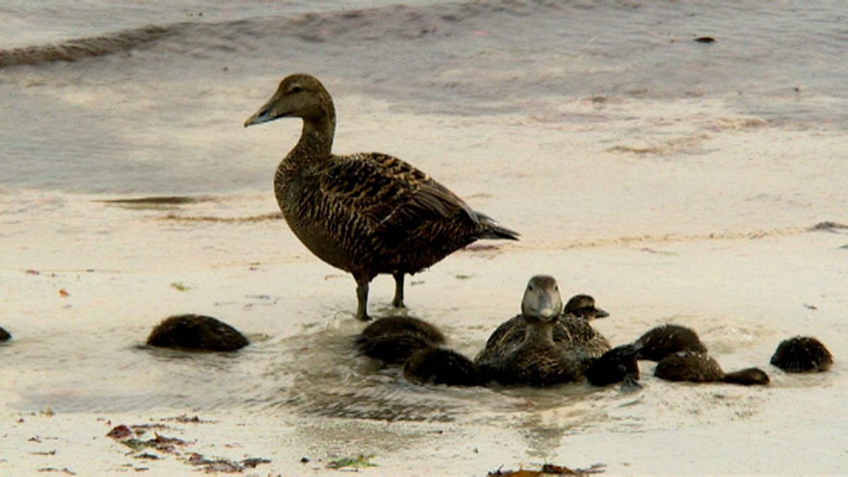 Bill Oddie sneaks up on an eider duck's nest. The duck tries to ignore him, relying on her camouflage to protect her. Female eiders are dull brown, but a closer look reveals lovely speckled feathers - ginger, buff, black and white as well as brown. She moves to reveal a tiny duckling and some eggs. Bill heads for the shore to watch the male eiders, who take no part in looking after the eggs. They look a bit tatty because they are moulting. They make an unusual sound, which Bill compares to a posh lady being surprised by gossip. They stick their chests out and bob their heads and coo, rather than quack. There are families of females and ducklings in the water, starting to gather into large creches. One duckling has gone astray and may be in danger from gulls, but there are none around. A female has scooped out a pool in the shallows and the ducklings are learning to feed.