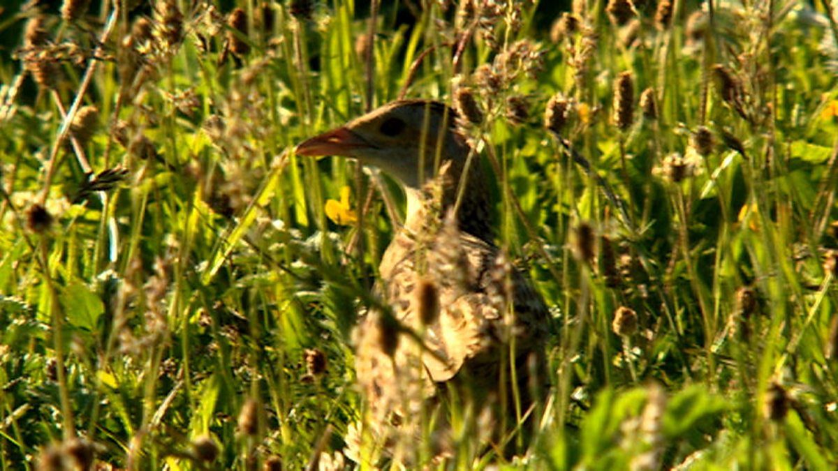 Corncrakes are calling, but can Bill Oddie see where the calls are coming from? These birds can throw their voices, to fool you as to their location. The grass is very long, so they are well hidden. Bill has only seen a corncrake once before. It is a very special bird because there are so few left in Britain. The RSPB and local farmers all co-operate to farm a certain way and cut the hay at set times to avoid destroying the nests. One pops into view for a moment - enough to satisfy Bill. He sings the tune of the Blue Danube waltz along with a corncrake's call.