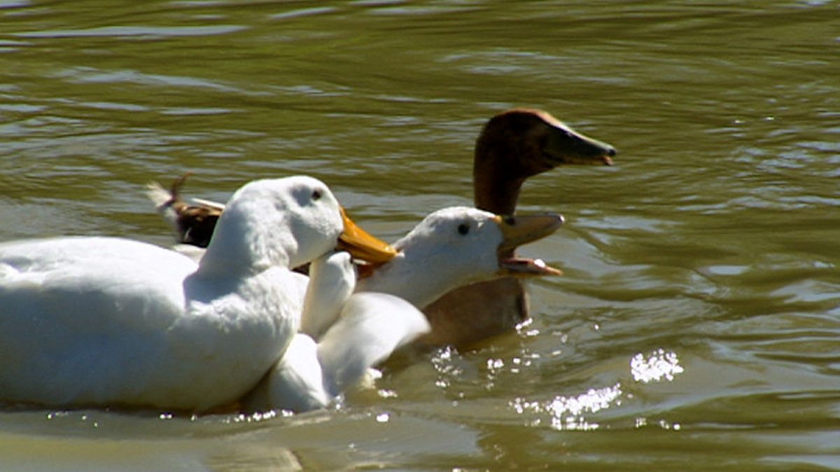Domestic ducks still behave as if they were wild ducks. That's not very surprising, since all these domestic ducks are descended from the mallard. One looks like it is part mallard and part Aylesbury. It doesn't take much to encourage ducks to interbreed - even in the wild they do it a lot. Some of these ducks will have been intentionally bred to look like this, but the others are the result of ducks doing what ducks do - a lot of mating! A tiny duck tries to mate with a very large Aylesbury, without success. The female ducks have a hard time as the males tend to gang up on them. Males are also scrapping with each other, but one pair of ducks is doing some more demure head bobbing displays, and there is lots of preening going on, to keep their feathers in waterproof.