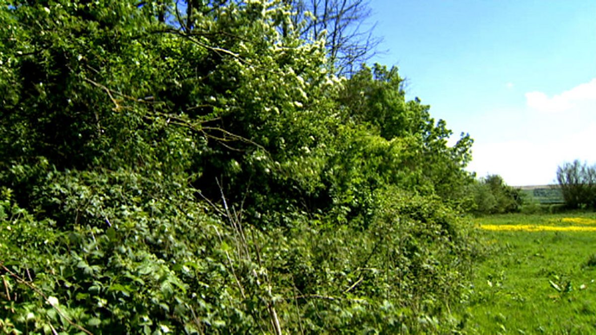 A lovely, old, tangly hedge is a man-made feature, but has now gone wild. But how old is it? Bill Oddie tells the formula for calculating this: if you take a 30 metre stretch of hedge, count the woody plants within it and multiply by 100 then you'll be able to tell what the age of the hedge is. This one has dead elms, oak, ash, holly... so it must be at least 500 or 600 years old. There are also may blossoms - hawthorn in bloom. The main plant of many hedges was hawthorn because they grew quickly, hence their alternative name 'quickthorn'. Hawthorn wood also provides the hottest heat of any wood burning fire. Hawthorn flowers were used in wedding bouquets and to summon the goddess of wind and wisdom, Maia. It was also thought that if you chopped a hawthorn down without good reason you'd have endless bad luck. The margins of the hedge have brambles and masses of wildflowers - bush vetch, red campion and ground ivy.