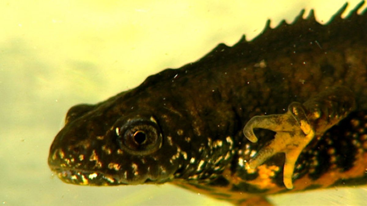 Bill Oddie takes a close look at a great crested newt in a tank. Your best chance to see great crested newts is at night, so these ones were caught the night before. You need a licence to handle great crested newts as they are both rare and protected. Compared to the smooth newt they are nearly twice as big, much darker on the back and the orange belly is startlingly vivid. Bill releases them back into the pond.