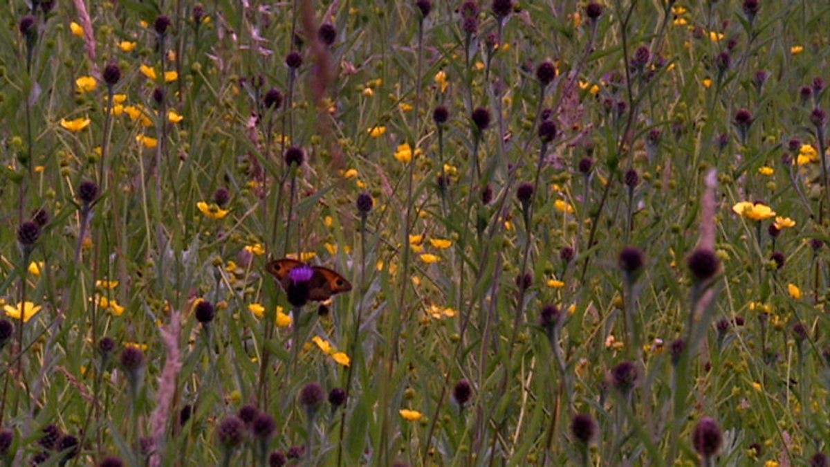 Mad dogs and Englishman time - its midday and Bill Oddie is out on a hot summer day in a dry meadow. It is a sea of yellows and purples - creeping thistle, buttercups and tufted vetch. Gardeners either love or hate tufted vetch. There are bees and butterflies everywhere, especially meadow browns. A male meadow brown hasn't got much going for it, but has a good name - it lives in a meadow and it is brown! They have a false eye marking on the wings, as do many butterflies to fool a predator into attacking the wrong part of its body.