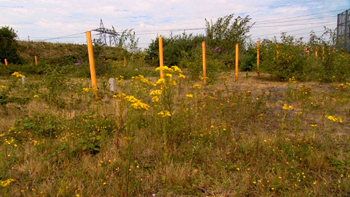 Wildflowers thrive on the dried out ash lagoons of an old London power station.