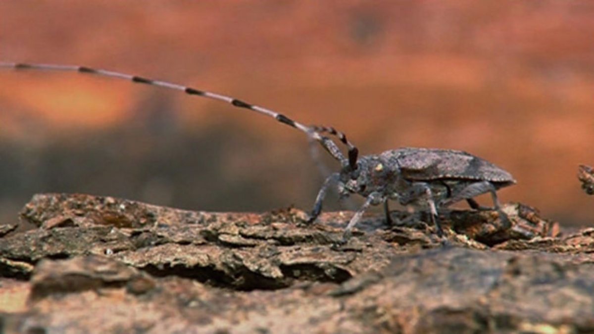 The forests of Scotland are home to many elusive creatures that you could spend a lifetime trying to find some of them, unless you know where to look. And that’s why you need to cheat sometimes. A wood yard is a real mecca for all Caledonian pine specialists, but there's one in particular that Simon King is trying to find. The timberman beetle is a real rarity and is unique to the Scots pine forest in the Highlands of Scotland - trying to find one out there in the wild wood would be like trying to find rocking horse droppings. The beetle has extraordinarily long antennae, measuring 6 inches from tip to tip, which it uses to sniff out dead wood, which is why this one has been attracted to the log pile. They also use them to find a mate, as these beetles are so hard to find and see with their camouflage.
