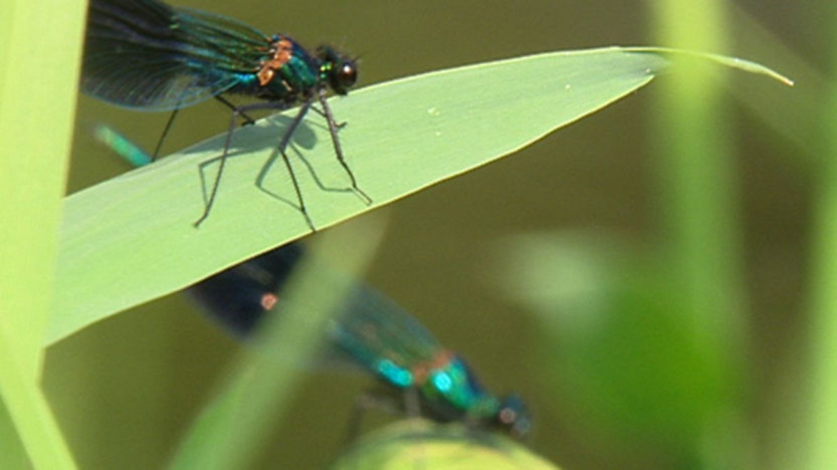 The banded demoiselle is technically a damselfly, which are all smaller than dragonflies and fold their wings along the length of their back. The males are a beautiful peacock blue in colour, whereas the females are a stunning bronze.