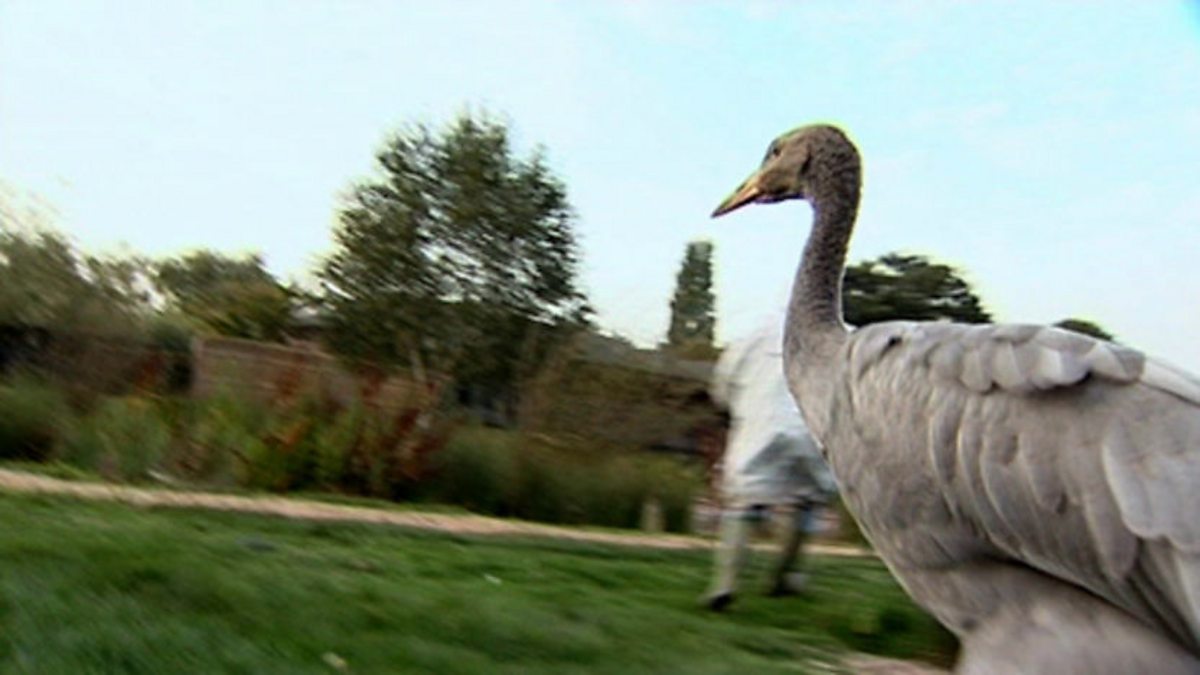 Day 34 at Crane School finds the youngsters in their dormitory. Inside they are safe from predators, such as foxes and rats, but they also have to be kept isolated as the birds don't get on and fight each other regularly. Over the coming days the team need to start exercising the birds together so that they become more sociable with one another so that they can form a group or flock by the time that they fledge. On day 42, things are starting to improve, the birds are less reliant on the dinner ladies for food, and are finding food for themselves by digging around in the wetland area. This self feeding also means they aren't fighting as much, so their bad behaviour is finally coming under control. One final lesson for the birds to learn is how to recognise and escape from predators. At Slimbridge they use a specially trained dog that looks a lot like a fox, playing an adult alarm call and getting the dinnerladies to run away from the danger. All helps to makes sure the young birds learn the crucial lesson - as foxes are the common crane’s main predator. The birds run away from the danger, which is just the response the keepers were looking for. Graduation from crane school may be just around the corner.