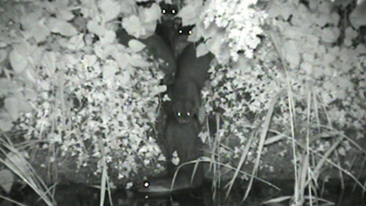 After setting up an infra-red camera on the river where the Springwatch team knew there was an otter holt, luck prevailed when the footage was checked. Hiding in the undergrowth, the shining pairs of eyes are the main give away as four otter pups and the adult female slide down the bank into the river.