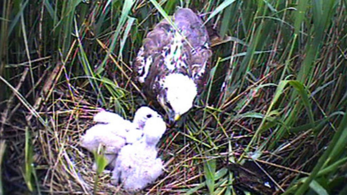 When Bill Oddie first went to East Anglia in the 1950s he searched high and low to see marsh harriers. Back then, there were only two pairs in this part of the country. The reason they have done so well in recent years is undoubtedly the work of conservationists creating new habitats for them and protecting them from persecution and poisoning. This mature female, with large patches of white on her, is collecting nest material. A camera set up by the Hawk and Owl trust looks at her nest and the chicks can be clearly seen with one that’s much smaller than the others. It's great to see these birds doing so well when they were so rare just 50 years ago.