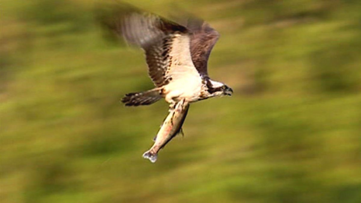 As they patrol for fish, ospreys fly high over the water to get a good clear view. They have to deal with glare and reflection, as well as decide on the fish’s size and position in the water before they commit themselves to a plunge dive. All this decision making has to take place whilst often being hassled mercilessly by other local birds such as black-headed gulls and crows. Most the birds hunting on the Rothimurcus fish farm are adult males providing for their families. Often weighing in at about 1.5 kilos, they may only be three times as heavy as the fish they are catching and this they must catch and manoeuvre out of the water. At the nest, the Springwatch team has been following the male as he has gone into hunting overdrive now that the chicks have hatched. It's the female’s job to tear the food into small pieces and share it out between the chicks. Before the eggs hatched, the female was fiddling incessantly with bits of moss and grass in the nest, making sure there was no way that the eggs could roll away by creating a deep moss covered cup. Once the eggs had hatched she began collecting new large branches, often breaking them directly from the tree to create a larger nest to protect her chicks. The male joined in her efforts after his hunting duties were over. Slow motion shows how he plucks material from a tree.