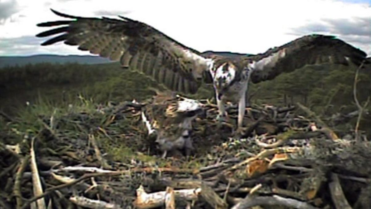 This is a male osprey, that Roy Dennis from the RSPB ringed when it was a chick. The bird is now 14 years old, a good age, but they can survive to be 20. The female isn't ringed, but the researchers think she is about 10 years old. This pair have been together for seven years and in that time they have raised 18 chicks. This year, their nest has three eggs which are being incubated by the female. The male bird’s duty is to provide the female with food while she is incubating, when he returns to the nest, she takes the food away to eat, while he looks after the eggs. When she returns she tries to budge him off the eggs, screeching at him as if to say, ‘Your job is to find the food, my job is to incubate the eggs!’. Eventually, he takes the hint and moves away.