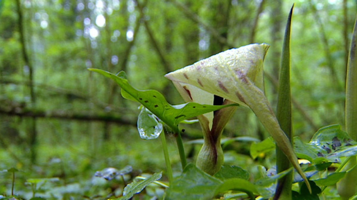 There can’t be many more quintessentially verdant places than a wood in early May, although what Bill Oddie loves about this time of the year is the trees are in different stages, some of these oaks are in full leaf, some of them almost wintry looking still. Only a couple of weeks ago this place would have been in a carpet of yellow with lesser celandine which are looking a bit floppy now. But just like in the garden in early May there’s another wave: bluebells, wood ruff, bugle. But if you want to see a really spooky plant growing right by the side of the road but easily overlooked, it’s this one - a whole bunch of wild arums. Now you may not know them as that because this flower has more names than any other British flower and let’s face it most of them are a bit naughty. For example cuckoo pint. Not naughty? It was if you were an Anglo-Saxon 'cos apparently cuckoo meant lively, if you know what I mean, and pint meant um... well come on, what does that look like? There’s some slightly less smutty names - parson in his pulpit, or baby in the cradle, lords and ladies or lovers. To be honest most of them are a bit naughty. But it’s kind of appropriate because the sex life of this flower really is rather extraordinary. What happens is normally it’s got two sections - the bit in the middle and the hood. The hood is often closed up, but when the bit in the middle gets really excited it becomes erect, proud and purple, slightly warm to the touch, and it has in fact got a rather subtle aroma which is lost on Bill, but is totally irresistible to insects. So in the insects go into this bulbous bit at the bottom, where they’re rewarded with a meal of nectar and in return they get themselves covered in pollen. What happens to the wild arum once the act has been consummated? Well, talk about nature imitating humanity - look it goes all droopy and shrivelled.