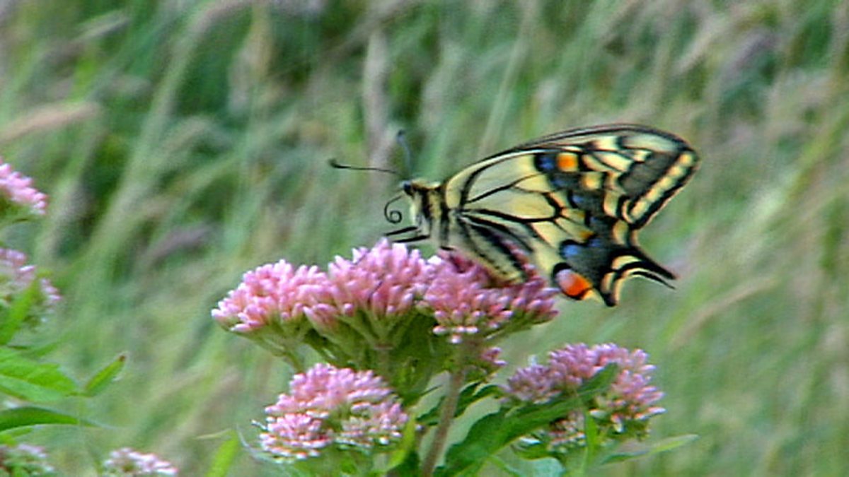 There's a reed warbler chuntering away, but there’s something else around here a lot more unusual and much less conspicuous. This rather nice feathery plant here is milk parsley which is a speciality of this area and right on the end of this leaf - that tiny little thing is an egg. That will hatch into a weeny little caterpillar but at that point it will look like a sort of bird dropping, which is very useful because it means that real birds won’t eat it. Eventually of course the caterpillar will turn into a cocoon, and the cocoon will hatch out into what's arguably Britain’s most beautiful and certainly its largest butterfly - the swallowtail. Normally you just see them zipping over the reeds. But every now and again you get a really cracking view. Those wings always remind Bill Oddie of stained glass windows, and those little streamers - that's the swallowtail bit - what a beauty!