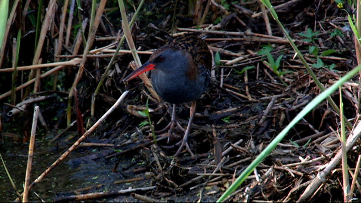 Bill Oddie spots a water rail from a birdwatcher's hide. Now that is a sight which you don’t see very often at all; usually water rails are seen in winter and even then it’s just a quick glimpse. The water rail has a chick with it - Bill's never seen one before. The chick is gorgeous, with downy feathers resembling black velvet. It’s like a mole on stilts. It's usually incredibly hard to see these things are because they breed right in the depths of the marsh. Bill's never known any warden even on a nature reserve to find a water rail’s nest and they very rarely see the chicks so this is something special. And now the kingfisher’s back on his perch. What more could you ask? We had the rain, then came the rainbow; we had the clouds, now here is the silver lining.