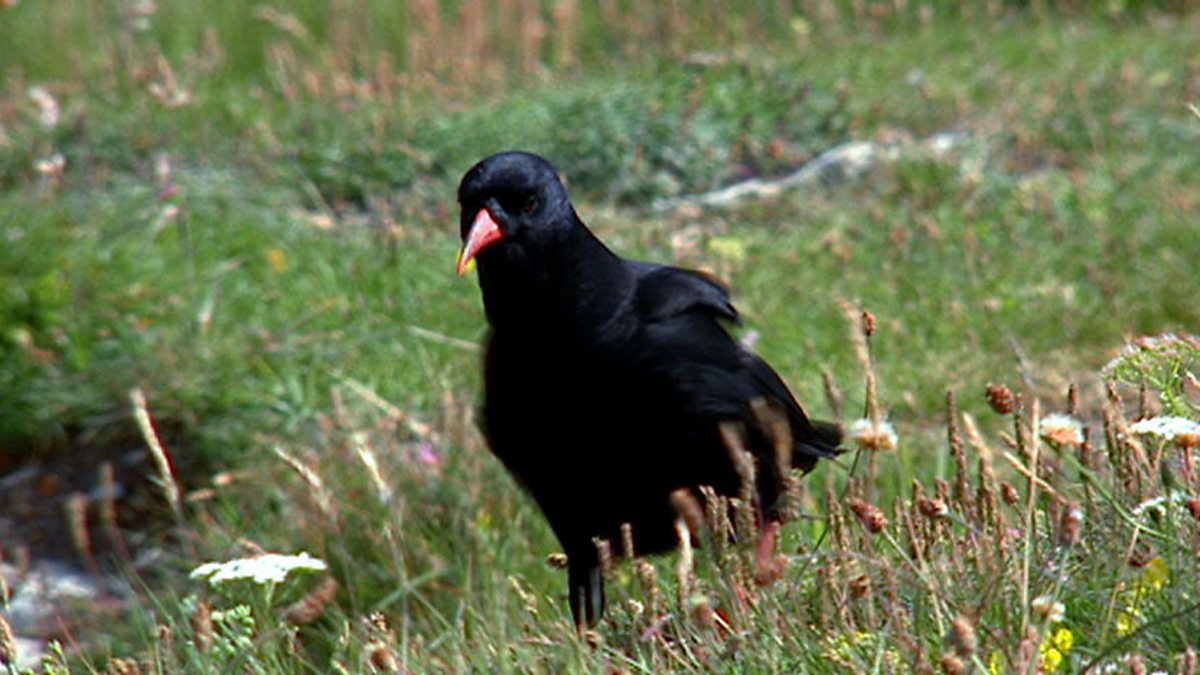 A headland by the sea with grass on top - a veritable sward cropped short by sheep - perfect habitat for a quintessentially Irish bird: the chough. But that isn't what Bill Oddie is seeing at the moment. These are Irish hares. There isn't actually a great deal of difference between English, Scottish, Welsh or Irish Hares I think this is sort of a sub species. The Irish are, quite rightly, very proud of these animals because let's face it they don’t have many mammals so let's hear it for the Irish hare. Bill continues his wild chough chase and finds plenty of meadow pipits and a little family of wheatears. They make themselves so conspicuous it's like they look along the horizon and think oh where can I perch where you'll get a really good view of me. It's because they like having a good view to look around for predators. It's one of the perks when you go out searching for a particular species that you're more or less guaranteed to see something else. Bill hears a chough and soon discovers them. They close their wings and literally just plummet. They are the same family as crows, most closely related to jackdaws. When they're flying they're easier to tell apart. You hear the call which is more explosive than a jackdaw and they've got those lovely raggedy wing tips and an extraordinary red curved bill, perfectly adapted for sticking into the turf and digging out little insects. That's why they like this soft ground and this is why they like Ireland I suppose because most of the ground is softened by the gentle rain.