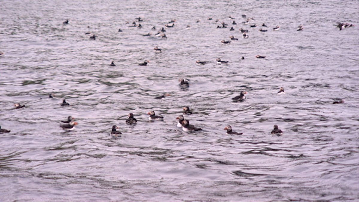 One of the things that St. Kilda is justly famous for is its absolutely enormous colonies of puffins. So how come Bill Oddie has been wandering round the island for a couple of days and hasn't seen a single one? Where are they? Take a look out to sea with a telescope and all is revealed - there they are, on the water, to Bill's dismay. Only a couple of days earlier Bill swore he'd never go back on a boat. But it's just a short trip to where the puffins can be seen close up. We're so used to seeing puffins posing, it's rather nice to see them in what is in fact their element. But on the cliffs or on the water, puffins are undeniably cute.