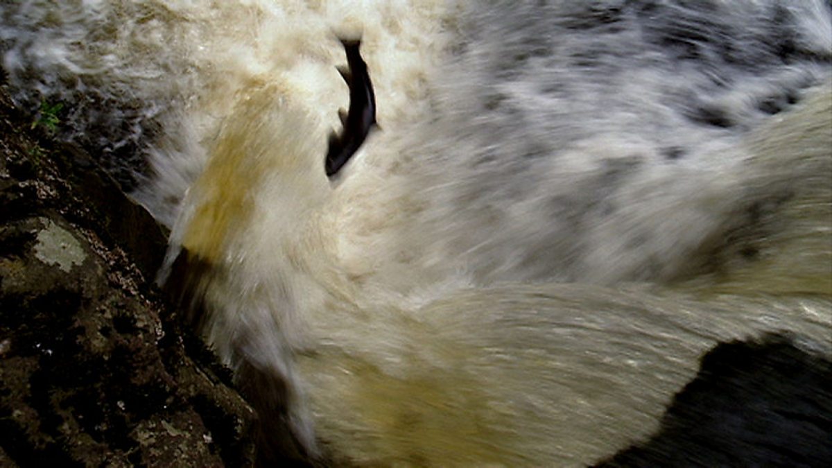 Some typical Autumn activity: squirrels storing up for the winter and the local birds just relaxing now the breeding season's over. However for the Atlantic salmon it's just beginning. They're swimming from the sea way up river to the calmer water where they were born and that's where they'll lay their eggs - and nothing is going to stop them. Salmon try to leap up a waterfall. It's a big fish yes, but this waterfall here, it's not that little. It is about 10 foot high. These fish are going to have to contemplate not only swimming against the current but then leaping up. It's the equivalent of a bloke thinking 'Four double decker buses - I'll jump over that no problem'. The light just bounces off them. They've got that wonderful pinkish sheen on them, probably means they're in fine breeding fettle. One salmon makes the leap - but he's still got 12 miles to go. Late September: the 'season of mists and mellow fruitfulness'. Bill Oddie is mellow because on a calm sunny day like this, winter seems far, far away despite the signs of its coming.