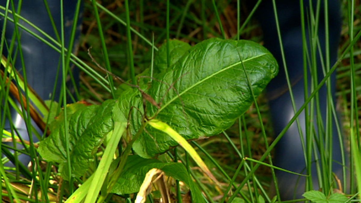 If you go tip-toeing through the nettles you are liable to get stung, and Bill Oddie does! But as every schoolboy and indeed schoolgirl knows, where there are nettles there are invariably dock leaves to relieve your sting. These are your common old garden dock, but over here is a distinctly uncommon dock. Bill is dwarfed indeed by the Loch Lomond dock. Not only very rare but absolutely enormous, a lot bigger than Bill and the leaves are correspondingly much bigger than ordinary docks. The leaf sort of heart shaped compared with the common dock. Folklore has it that this Loch Lomond dock can be used medicinally for all sorts of things from scurvy to blood conditions, skin conditions, rheumatism, piles just about anything - except stings.