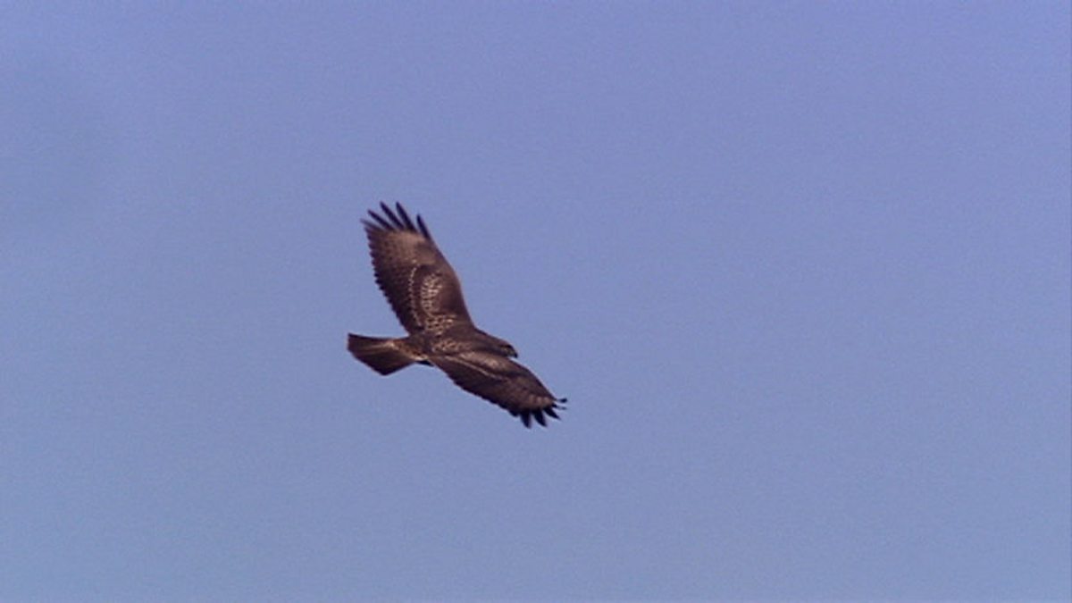Bill Oddie is near Loch Lomomd, trying to spot golden eagles. The first thing he sees is a buzzard, or tourist eagle as it's sometimes referred to here. There's an old adage bird watchers use: if you've got two species that are very similar you won't be sure until you see the real thing, but when you do you'll know. Now that is an eagle. It's a long way off but can't you sense the size of that? It's got wings longer than on a buzzard, more of a neck, more of a tail. Here's a bird with a two metre wingspan so we're talking big birds. The eagle lands on the mountainside - that's a first for Bill as he's never seen a golden eagle land. Especially not on a crag like that. I know they're called golden, but really the main head part is the golden part and you can barely pick that out at a distance. They usually look like a big, dark brown things.