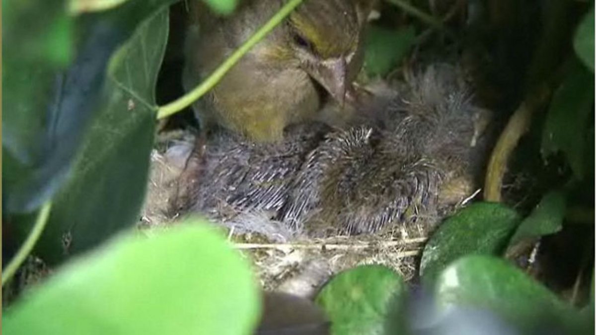 Catch up with the greenfinch family in their hanging garden nest.