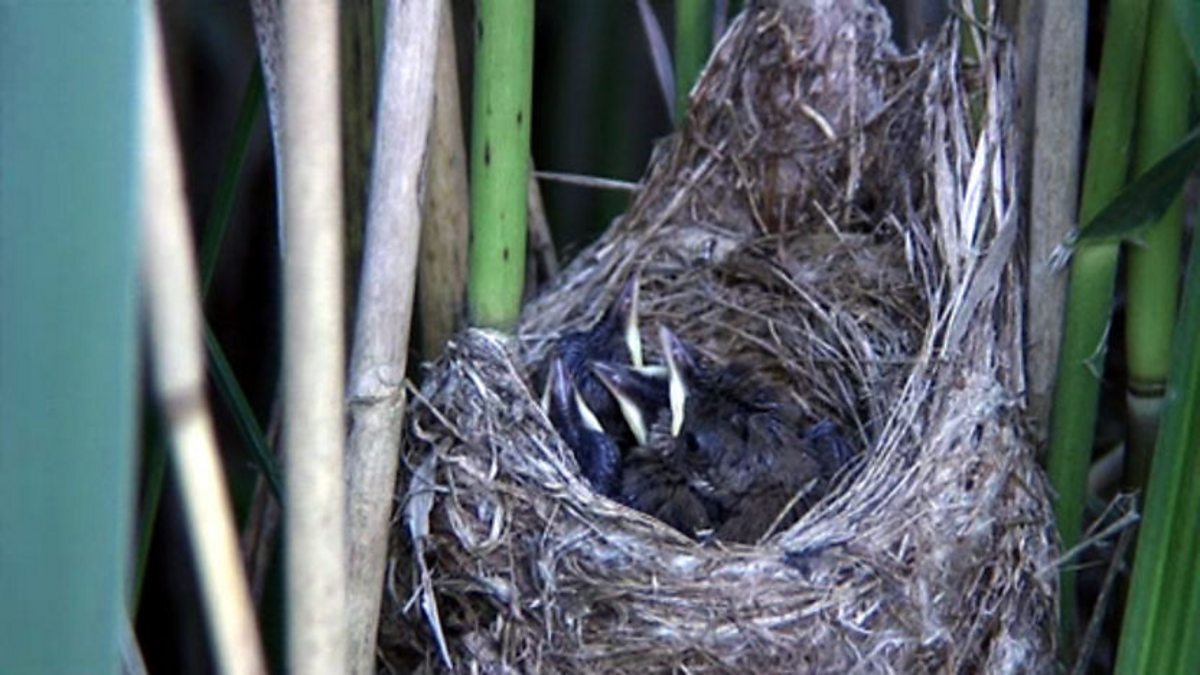 The reed warbler chicks are developing fast. Join them in between meals in their reed nest.