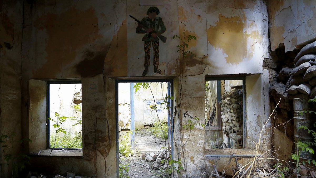 (Photo: The painted image of a soldier marks a battle position in an abandoned home inside the United Nations-controlled buffer zone that cuts across the Cypriot divided capital Nicosia. Dated May 14 2015.)