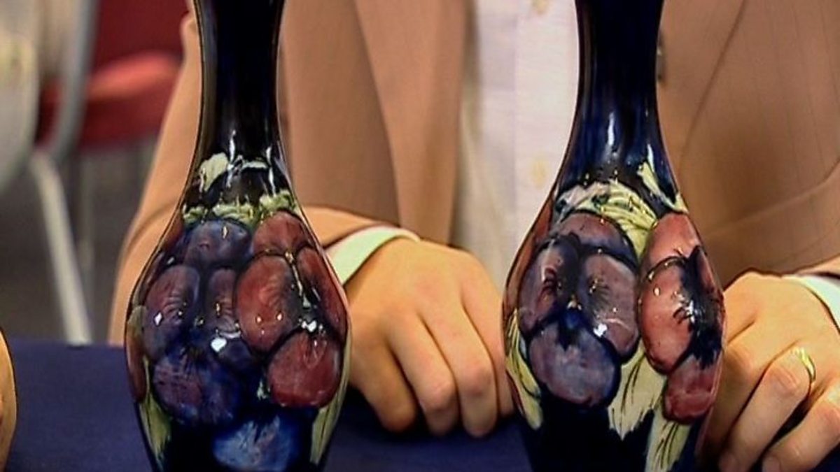 A clip from the Flog It archives. At a Valuation Day in Telford, Christine brings along two small vases which she thinks could be from the famous Moorcroft factory. She only paid £4 for them - so even Flog It expert Adam Partridge is excited to see what they make at auction.