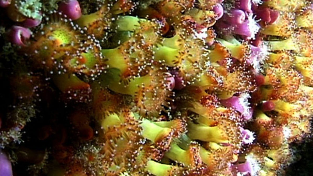 In the twilight world of a chasm on the outer edge of the islands, sea spiders chew deadman’s fingers - a soft coral that’s common at these depths. Sponges and feather stars feast on the microscopic life swept along in the tide. Delicate, slow-growing sea fans angle their growth across the current to increase their catch of food. Below the level where weed can grow, a multicoloured carpet of sea anemones covers the rocks. Even more spectacular - tiny jewel anemones colonise the overhanging edges and vertical faces of these underwater cliffs. Only in the clearest seas will they form such dazzling displays. For those divers that venture beyond the shallow, more recently lost lands of Scilly, to the edge of the rocky plateau on which the archipelago stands, this is an underwater garden of unrivalled brilliance. A feature for which the islands are justly famed. On a smaller scale, the Devonshire cup coral is solitary. Little larger than a thumb-nail, it is only common in the south and west of Britain. Rarer still, and confined to warmer seas, the yellow cup coral is one of Scilly's real living' treasures. Slow growing and long lived, they are more at home in the Mediterranean. Indeed so rich is the undersea life here, it is now defined as a marine park of national importance.