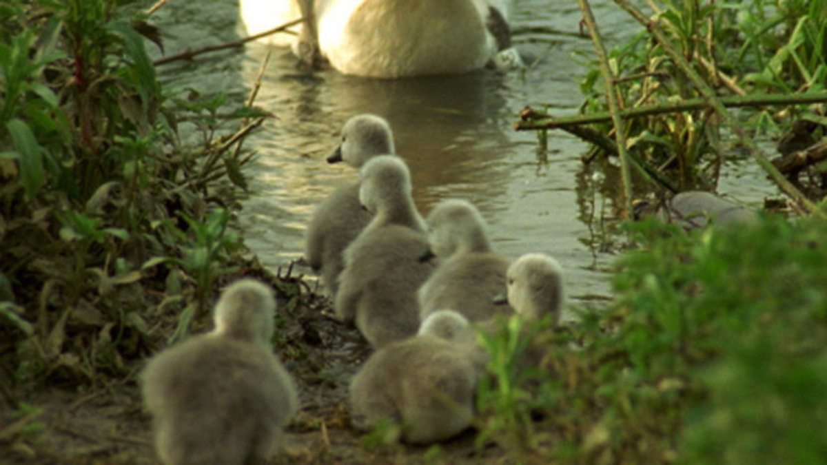 Of all the dangers on the Thames, the most unpredictable creature is the river itself. Spring cloudbursts turn the youthful Thames into a torrent. A family of new cygnets have been flooded from their nest and drowned, but it's still early enough in the year for the parents to try again. Others have chosen a better location. Swans try to outwit the river and insure against disaster by constructing high rise nests, but it's easy to get caught out after heavy April showers. They tend to stick to the same mate and the same nest site. If it works why change it? The female may take two weeks to lay a clutch of eggs, but incubation is delayed so that all her ugly duckings hatch out together within a couple of days. No sooner are the babies dry than they have to get wet again. A good nest site may not be a suitable feeding ground, so they have to set off on a hazardous journey. There's no way of testing the water first - it's sink or swim. Only 50% of cygnets survive their first few days. So far so good - everyone's accounted for, and hungry. With so much to learn you can't afford to sit out many lessons. When it's time to turn round and head back to the nest, if you haven'y managed to bag a ride on the back of a parent, it's a tall order going against the flow. It might be safer to go the long way round, cross country. Because they use the same nest site every year, swans know their territory well, on and off the water. This route march is all a part of earning your wings. At last, just one more hill to climb.