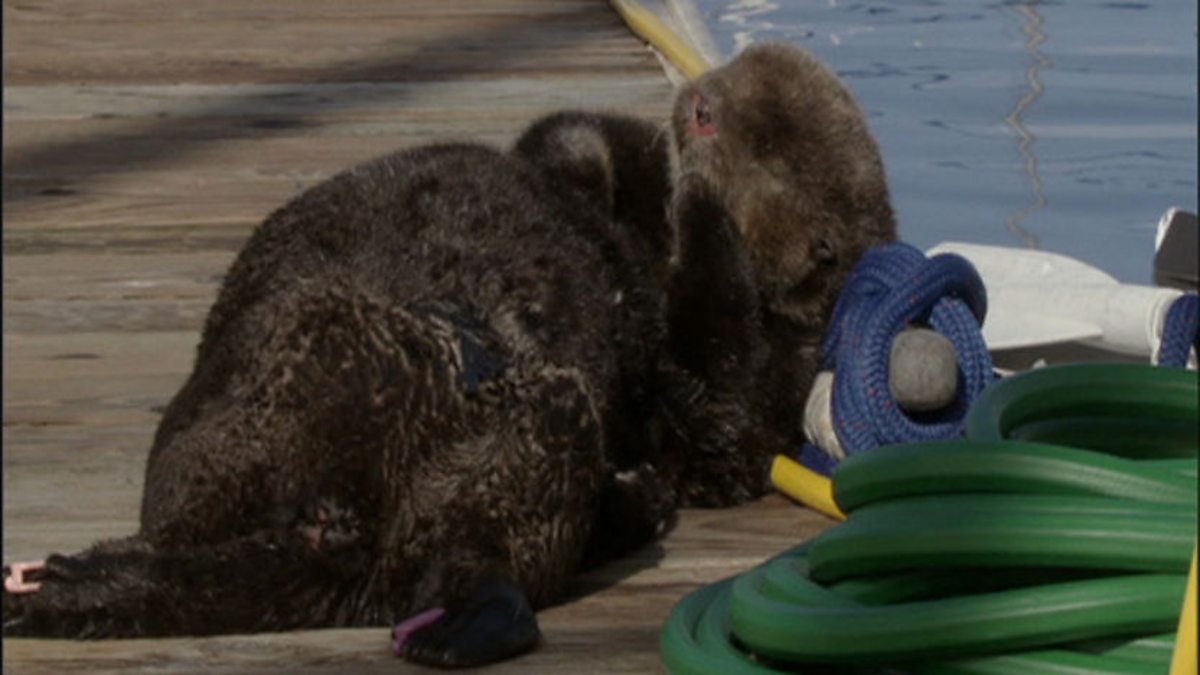 Without a pup to suckle, a female otter attracts the attention of a gentle male.