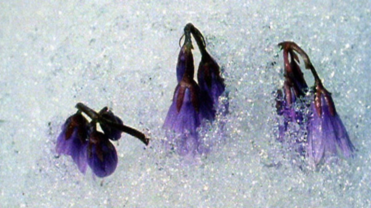 In winter, conditions for plants on the high peaks of the Alps can be just as severe as in the Arctic, 2,000 miles to the north. But when spring comes to the Alps the sun rises higher in the sky than in the Arctic and is warm enough to melt most of the snow. As it melts, the snow reveals snowbells that are already in flower. The plants will have formed their flower buds in the previous autumn, before they shut down their activities for the winter. The buds then remain dormant until the spring sunshine filters down through the snow and triggers them into action causing them to open even before the snow above them has melted. Because it is cold for so much of the year, the vegetation decays only very slowly and a peaty layer forms. But it is only a thin layer over rock and boulders, so trees find it very difficult to take root. Also, avalanches regularly sweep the Alpine slopes, killing saplings before they can get properly established. Because of this, plants with shallow roots have these mountains largely to themselves, and in summer the high meadows fill with colourful flowers. But for every thousand feet one climbs, the average temperature drops by about 3 degrees which means that plants living in the high mountains must be able to withstand severe cold. Many plants here therefore form small rounded humps to keep themselves out of the chilling wind.