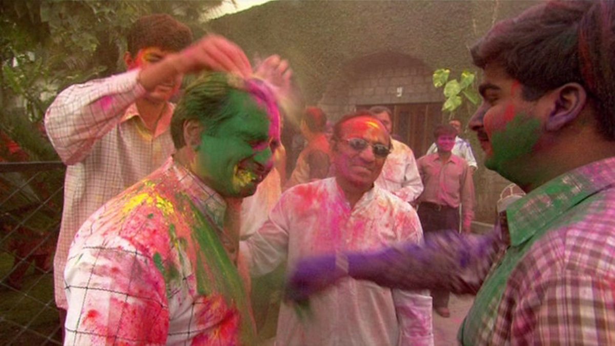 Comedian Sanjeev Bhaskar experiences Holi, a spring Hindu festival celebrated by people throwing coloured powder and water at each other.