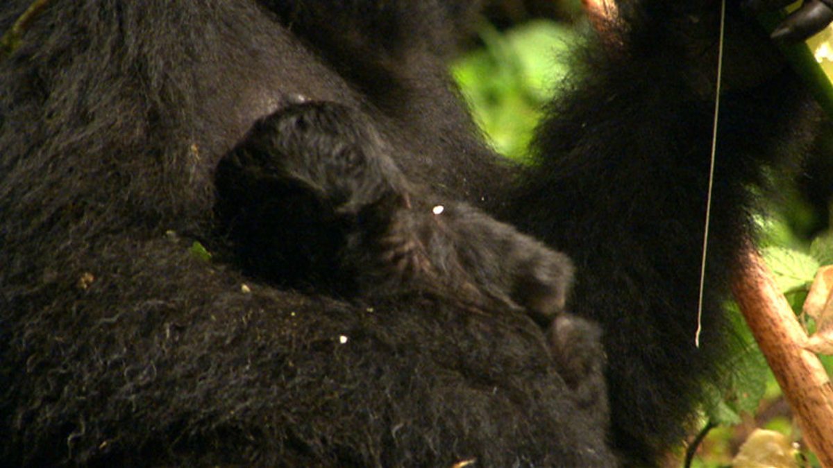 A wary gorilla mother allows researchers a rare glimpse of her new born baby.