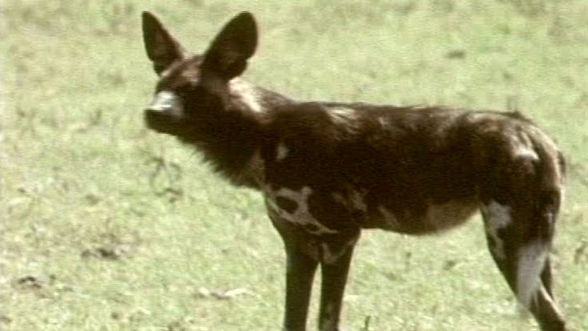 This is an African Wild Dog. Today they are endangered because they need a very large area to hunt in and are in competition with humans, lions and hyenas.