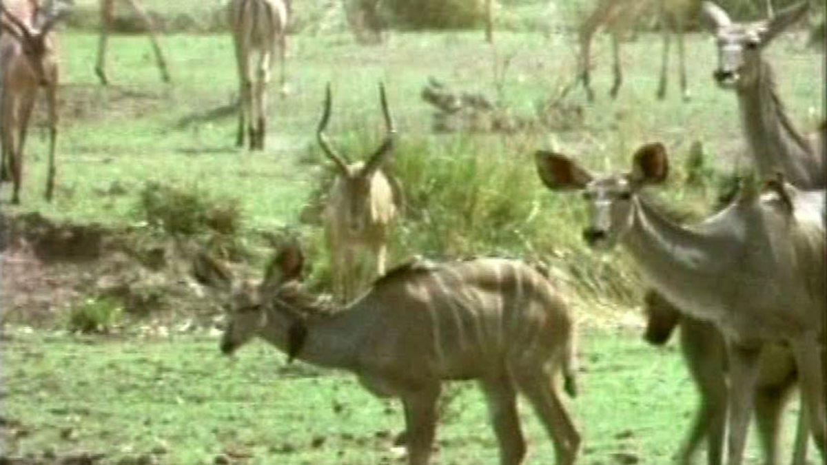 Down at the waterhole a small group of Kudu are taking a wary drink. Their huge ears are always on the move which is not surprising since they are on the menu for many of the African predators like lion, leopard and hyena. But with baboons and a large herd of impala also keeping watch here there is some safety in numbers.