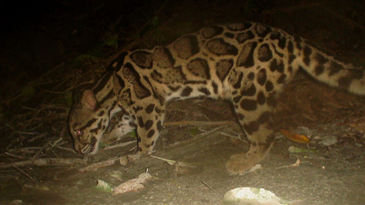 A rare clouded leopard is photographed by a camera trap near the research camp.